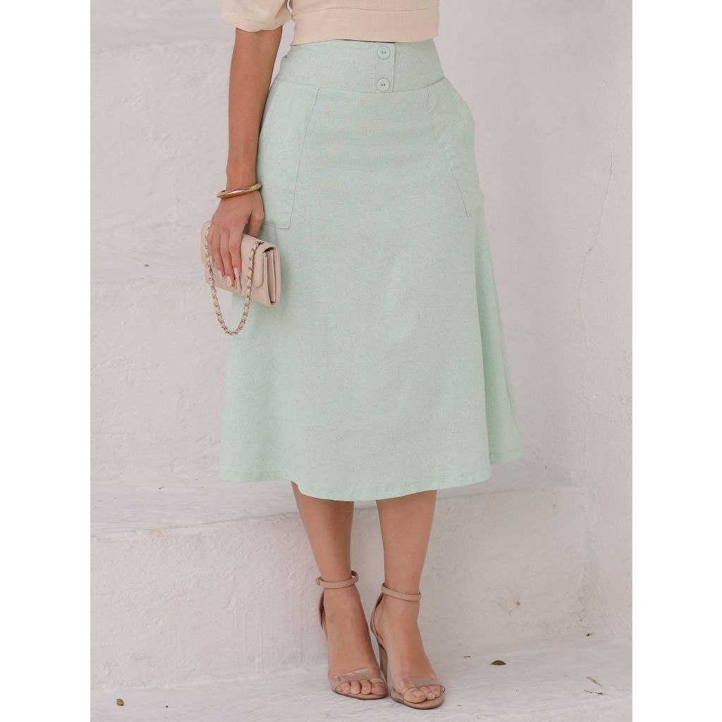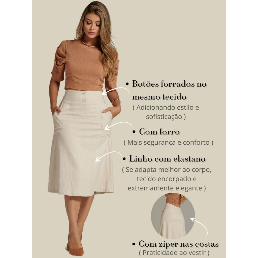 Confeccionada em tecido com toque natural e caimento fluido, a peça acompanha os movimentos do corpo com leveza, oferecendo conforto absoluto para o uso diário. Os bolsos funcionais adicionam praticidade sem interferir na estética limpa e refinada da saia.
